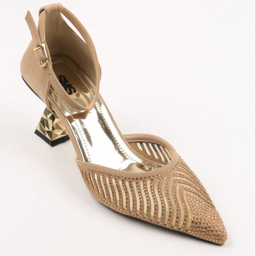 تبحثين عن حذاء مريح وأنيق في الوقت ذاته؟ إليكِ حذاء فلاكا من SMS SHOES بخامة من الشمواه والشبك وسطح مرصع بالكريستال مع سير من الكاحل وكعب الهرم .