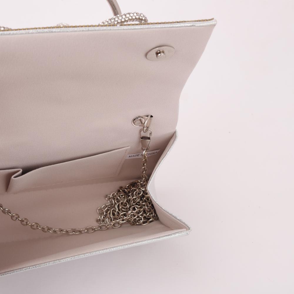 تحتوي الشنطة على شريط كرستالي مزدوج يضفي لمسة من الأناقة والبريق. يعكس الشريط الكرستالي الضوء ويضيف لمعانًا وجمالًا على الشنطة.