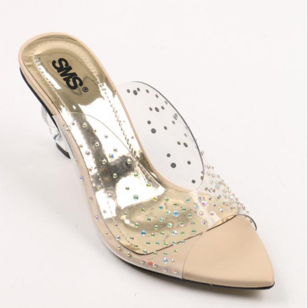 هذا الشبشب النسائي مميز بوجه شفاف مرصع بالكريستال اللامع، وكعب شفاف بشكل حلقات. يتميز الوجه العلوي للشبشب بتصميم أنيق وجذاب، حيث يكون شفافاً ومرصعاً بالكريستال اللامع، مما يضيف لمعاناً جميلاً على الشبشب. ويتميز الكعب بتصميمه الأنيق والعصري، حيث يكون شفافاً ومزيناً بحلقات و الجزء العلوي من الشبشب مصنوعاً من مواد عالي الجوده يعد هذا الشبشب منتجاً جذاباً ومثالياً للنساء اللاتي يبحثن عن الأناقة والراحة في الوقت نفسه.