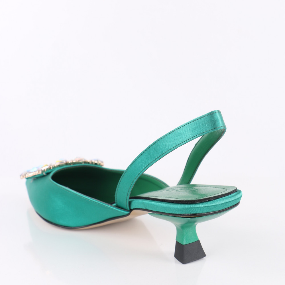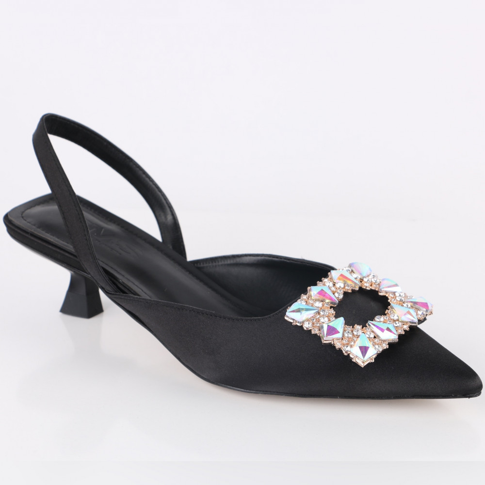 يأتي هذا الحذاء بتصميم رائع ومميز، حيث يتميز الحذاء بالخامة الساتانية الناعمة التي تضفي لمسة من الأناقة والفخامة. ويتميز الحذاء بوجود اكسسوارة كرستالية ملونة جميلة عند الأصابع تضفي لمسة من الألوان والجمال. ويتميز الحذاء بكعب منخفض يبلغ حوالي 4 سم، مما يجعله مثاليًا للارتداء اليومي.